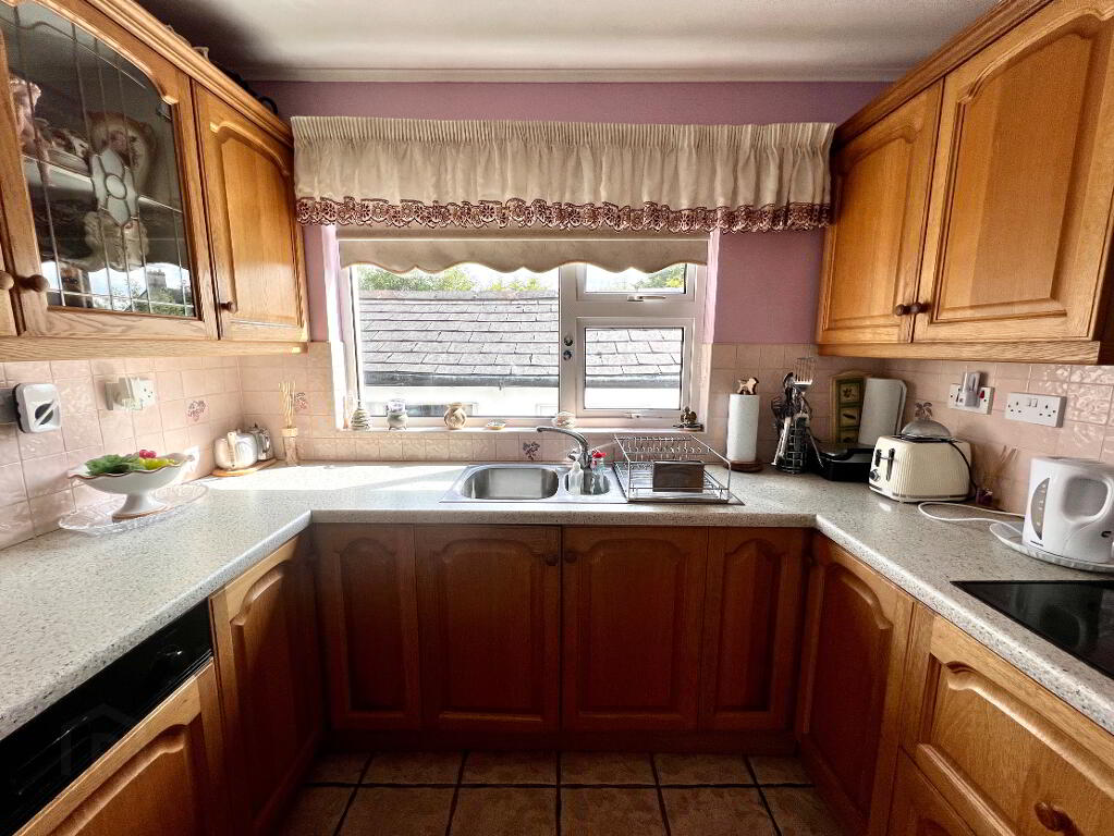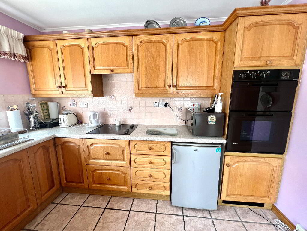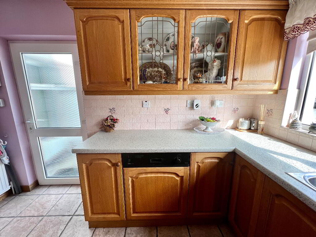 Kitchen 10'11 x 8'10 Eye and low level units, 1 1/2 bowl stainless steel sink unit with mixer tap, hob, oven and extractor fan, integrated dishwasher, partly tiled walls, tiled floor.