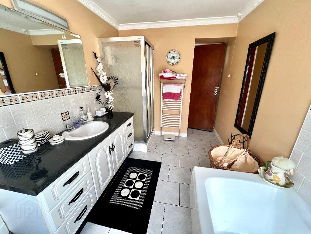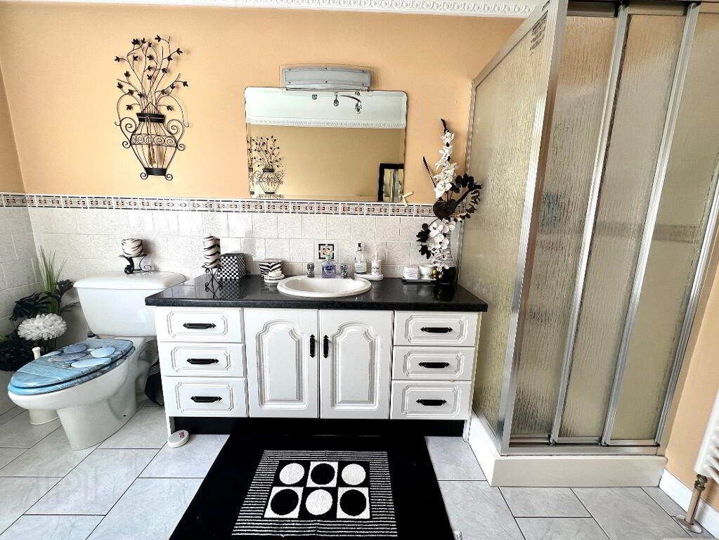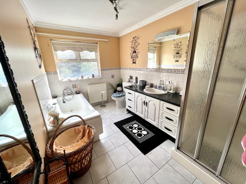 Bathroom 10'11 x 7'2 Bath, wash hand basin set in vanity unit, WC, walk in electric shower, wall mirror, partly tiled walls, wall light, heated towel rail, tiled floor.