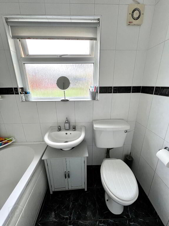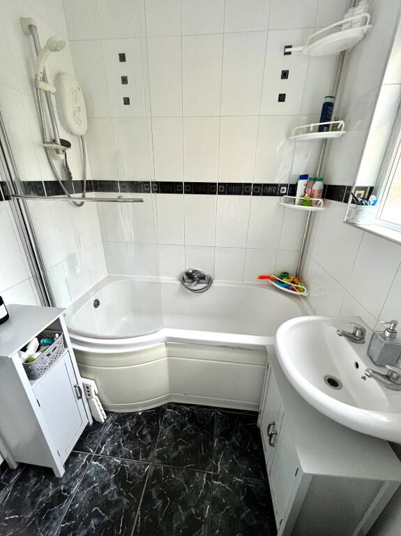 Bathroom Bath with electric shower overhead, wash hand basin and WC, fully tiled walls, tiled floor.