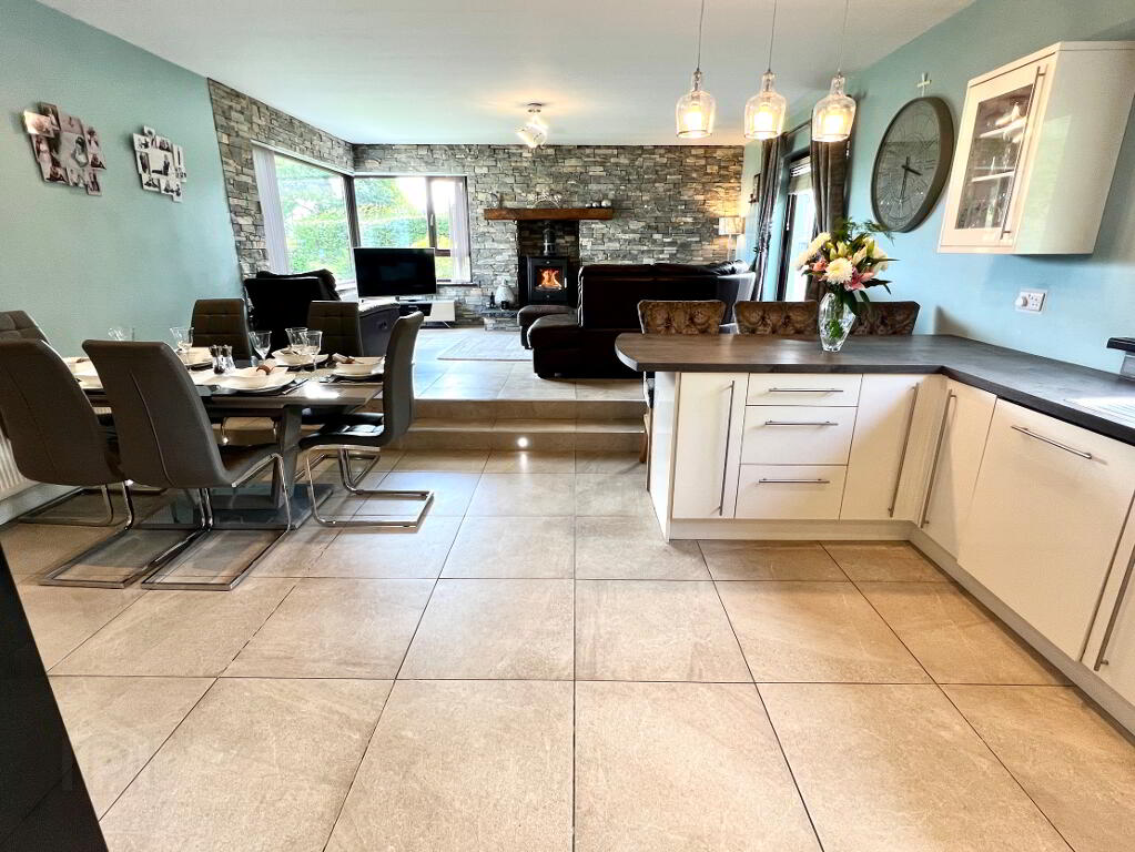 Kitchen/Dining /Family Room 30'5 x 17'2 Eye and low level units, 1 1/2 bowl stainless steel sink unit with mixer tap, belling range cooker, extractor fan, american style fridge/freezer, integrated dishwasher, breakfast bar, steps up to family area with feature stone walls, multi fuel stove with high output back boiler, double patio doors.