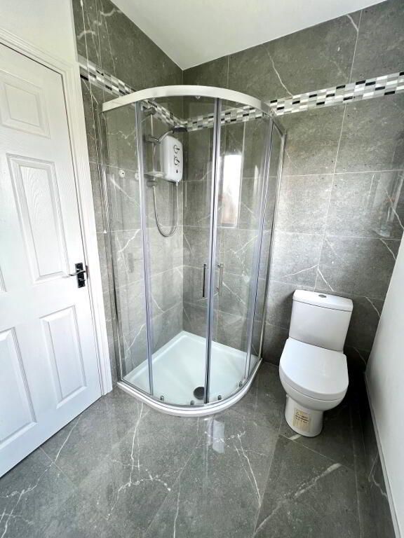 Shower Room Fully tiled walk in electric shower, wash hand basin set in vanity unit, WC, partly tiled walls, tiled floor, heated towel rail.