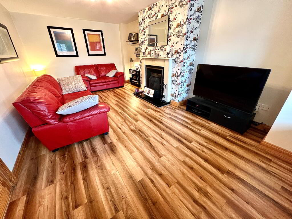 Lounge 19'5 x 11'8 (to widest points) Cast iron fireplace with wooden surround and granite hearth, laminated wooden floor.