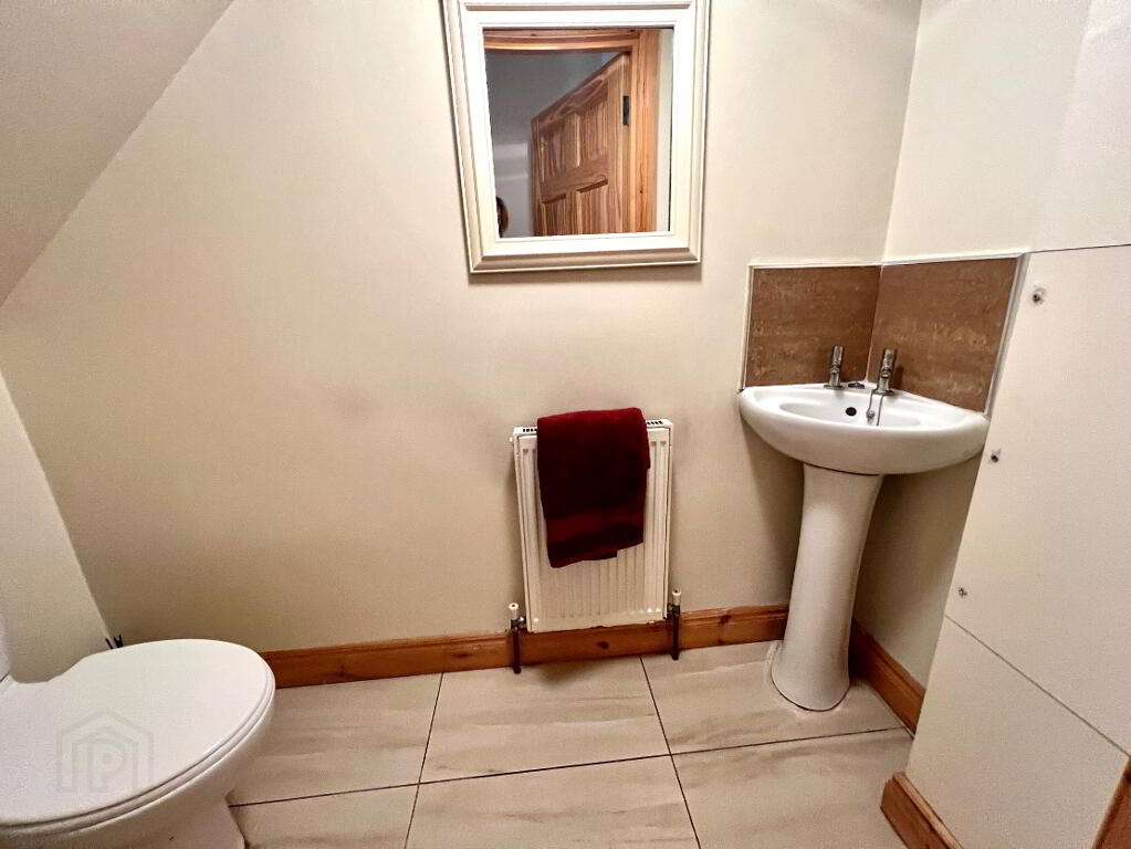 Downstairs WC WC and wash hand basin, partly tiled wall, tiled floor.