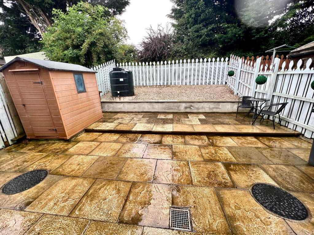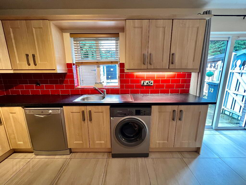 Kitchen/Dining 18'8 x 10'9 Eye and low level units, single drainer stainless steel sink unit with mixer tap, hob, oven and extractor fan, plumbed for washing machine, plumbed for dishwasher, partly tiled walls, patio door, tiled floor.