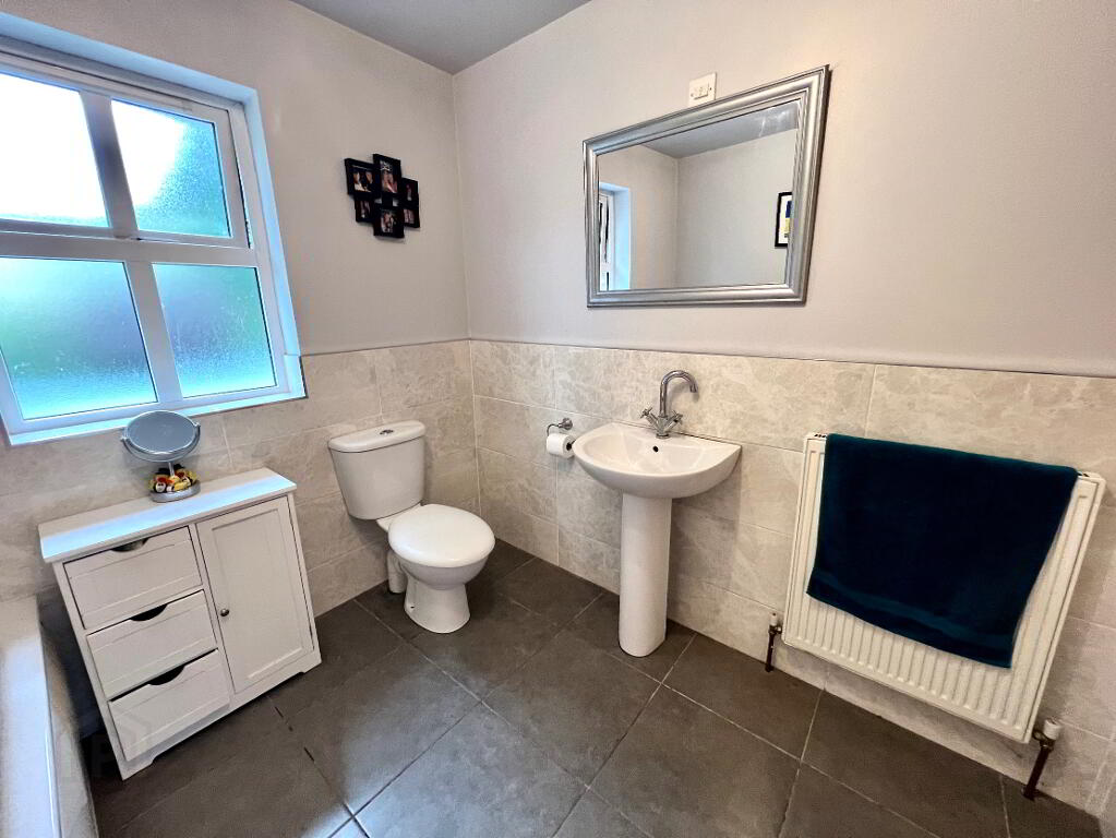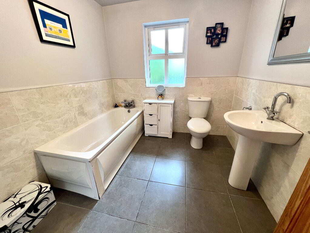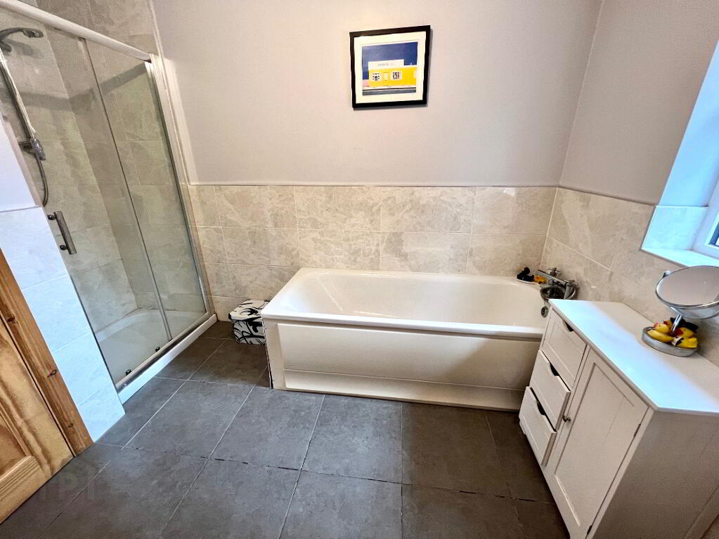 Bathroom Bath, wash hand basin, WC, fully tiled walk in electric shower, partly tiled walls, tiled floor.