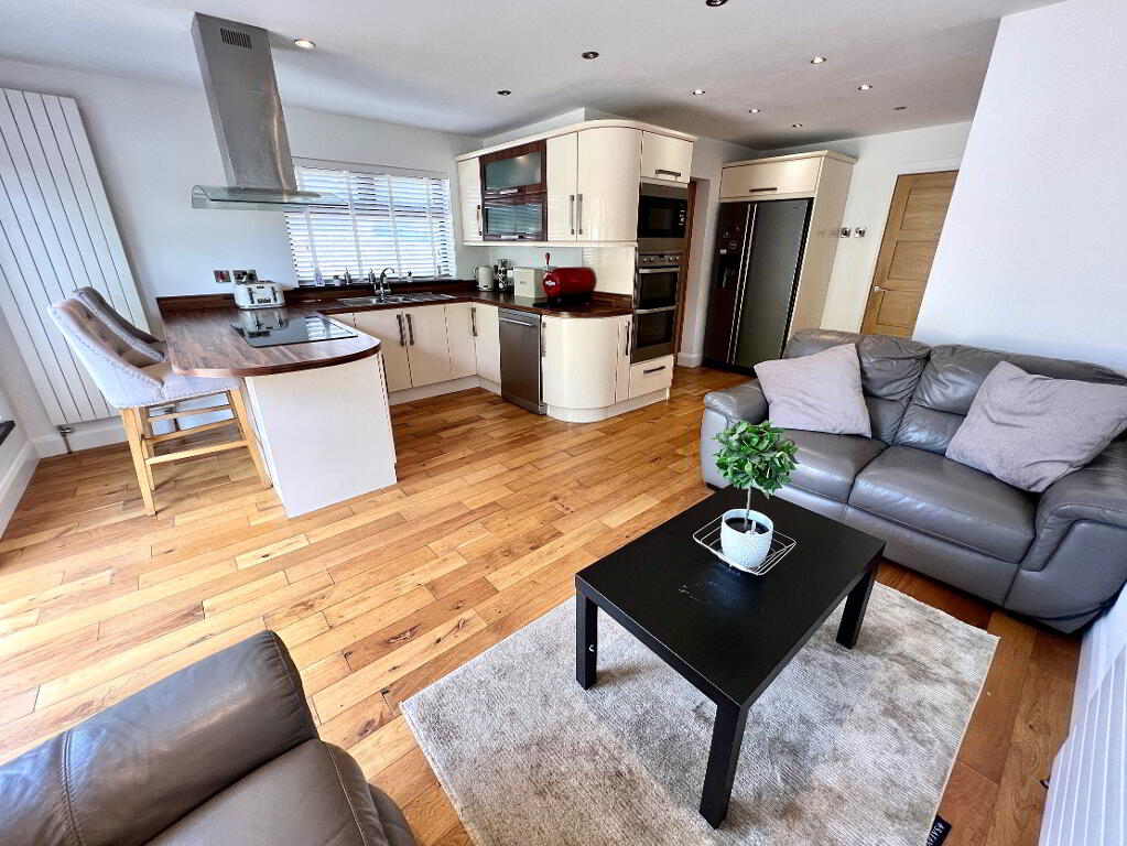 Kitchen/Dining/Family Area 21'2 x 15'10 (to widest points) Eye and low level units, 1 1/2 bowl stainless steel sink unit with mixer tap, hob, and extractor fan, double oven, built in microwave, plumbed for dishwasher, wooden floor, recessed lighting, double patio doors.