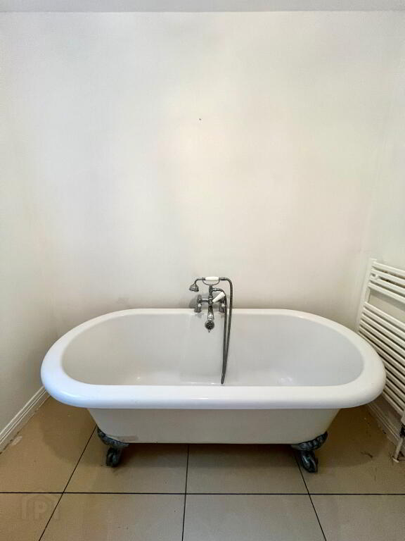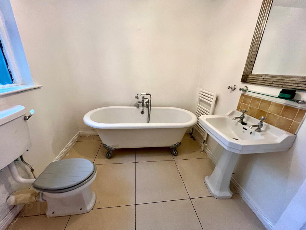Bathroom Free standing bath with claw feet, wash hand basin and WC, partly tiled walls, tiled floor.