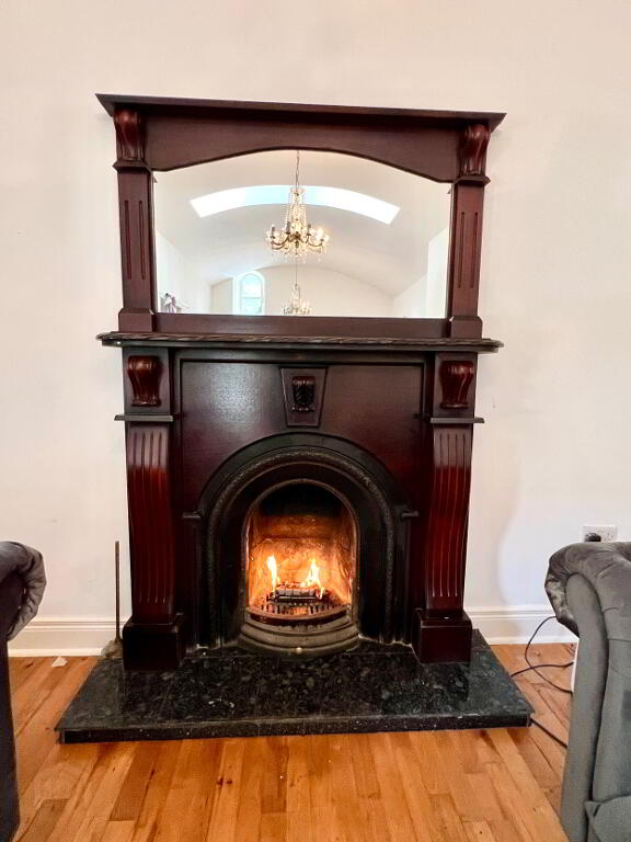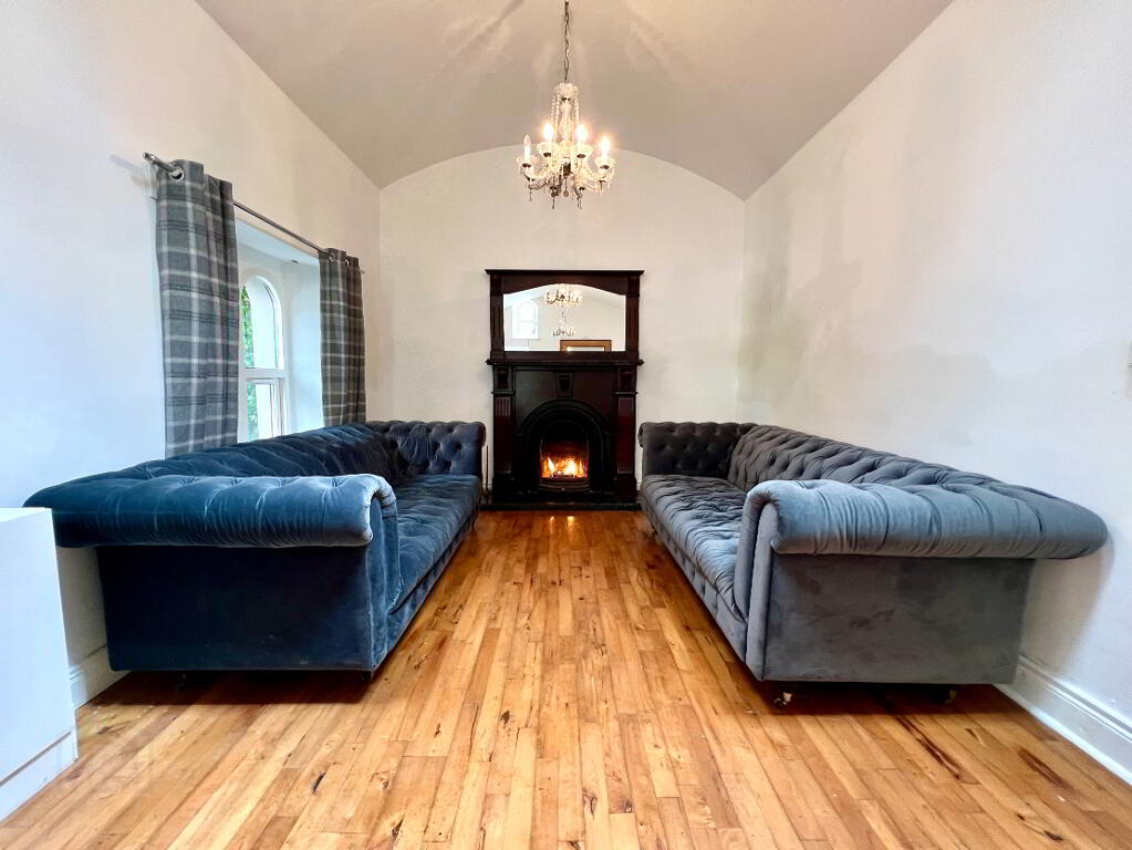 Lounge 22'11 x 11'7 Dual aspect, cast iron fireplace with wooden surround and matching over mantle mirror, wooden floor, archway to kitchen/dining.