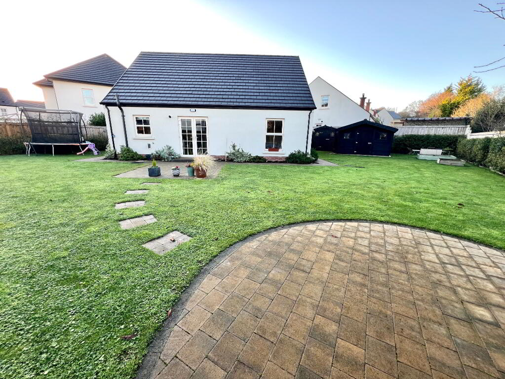 Large garden to side and rear laid in lawn enclosed by fence and hedge.